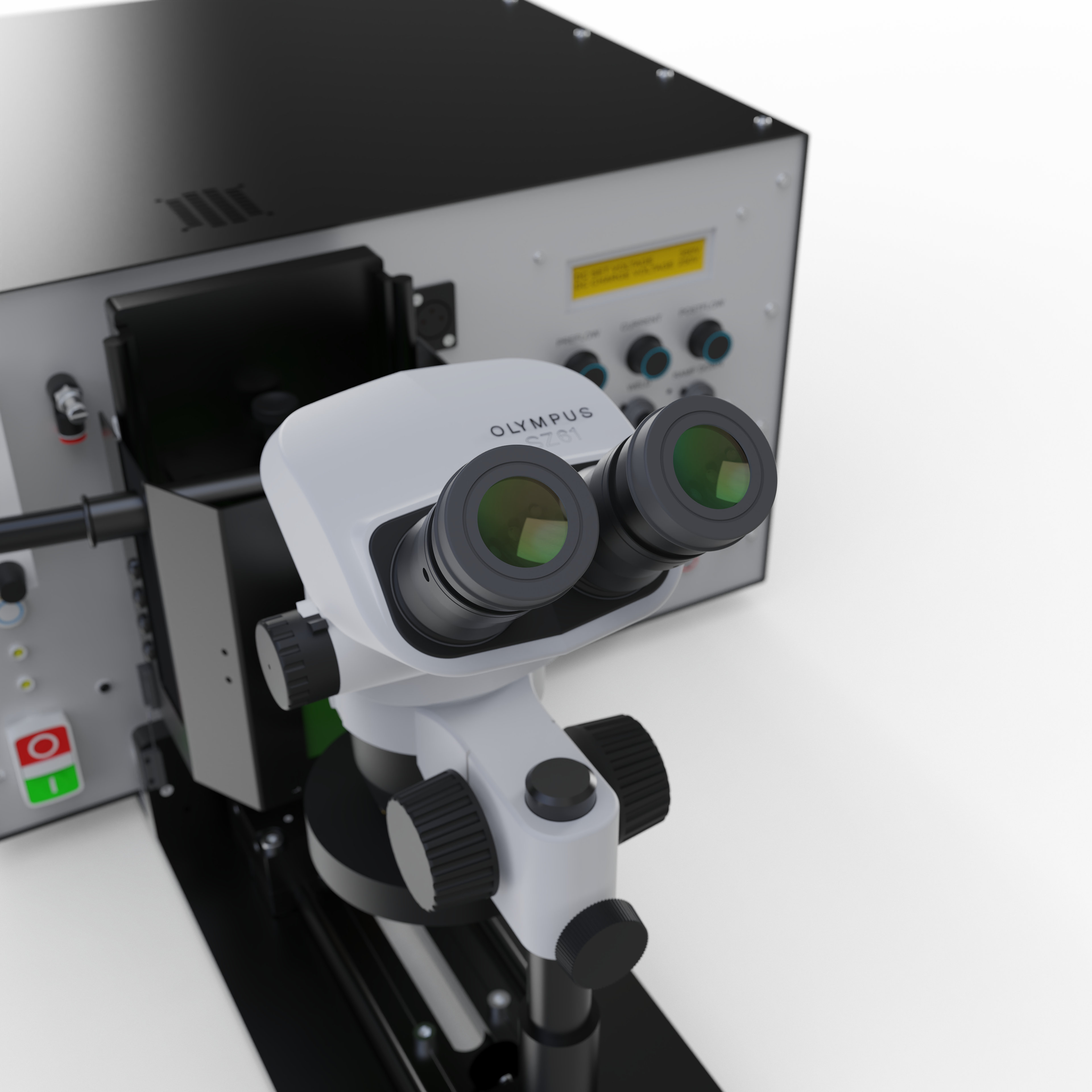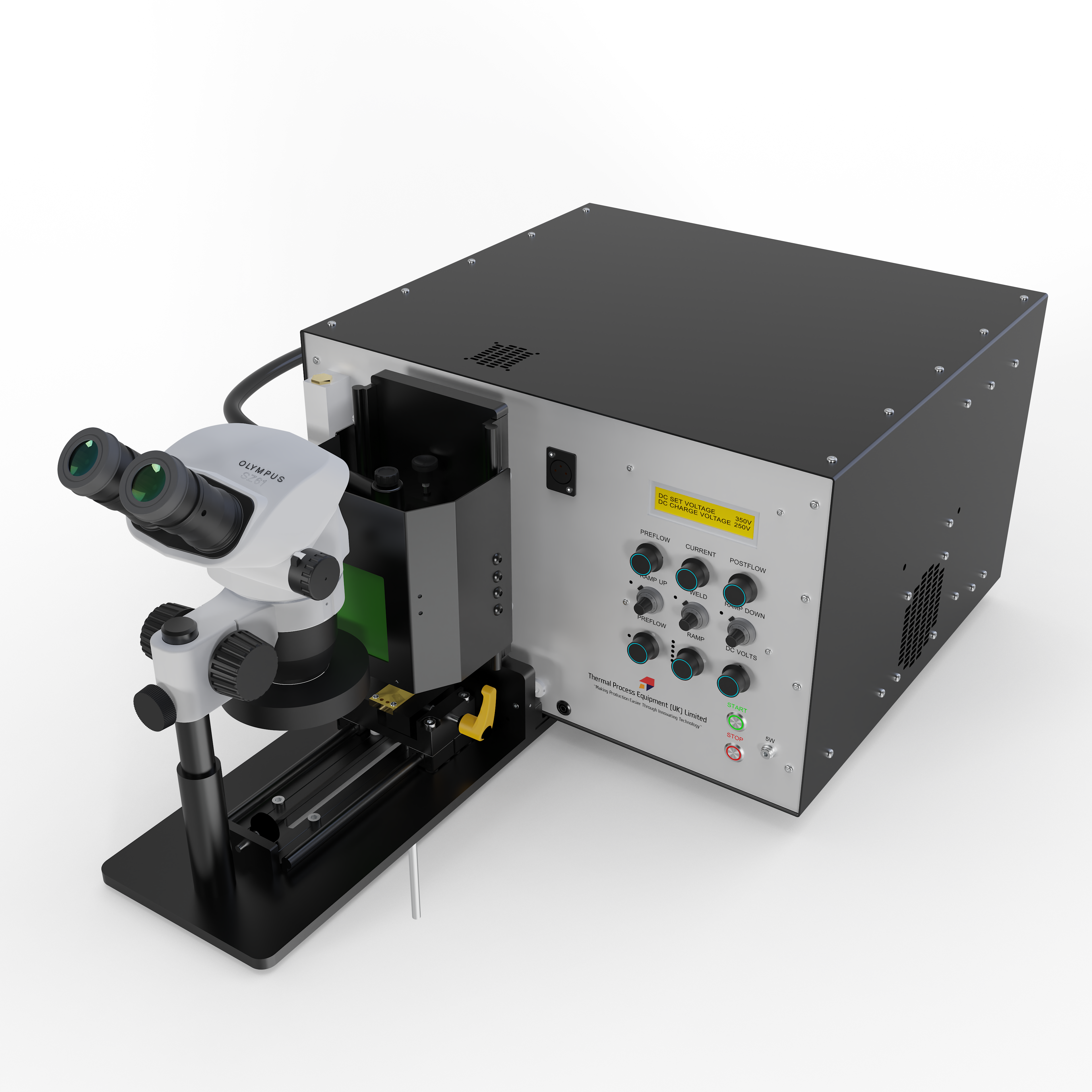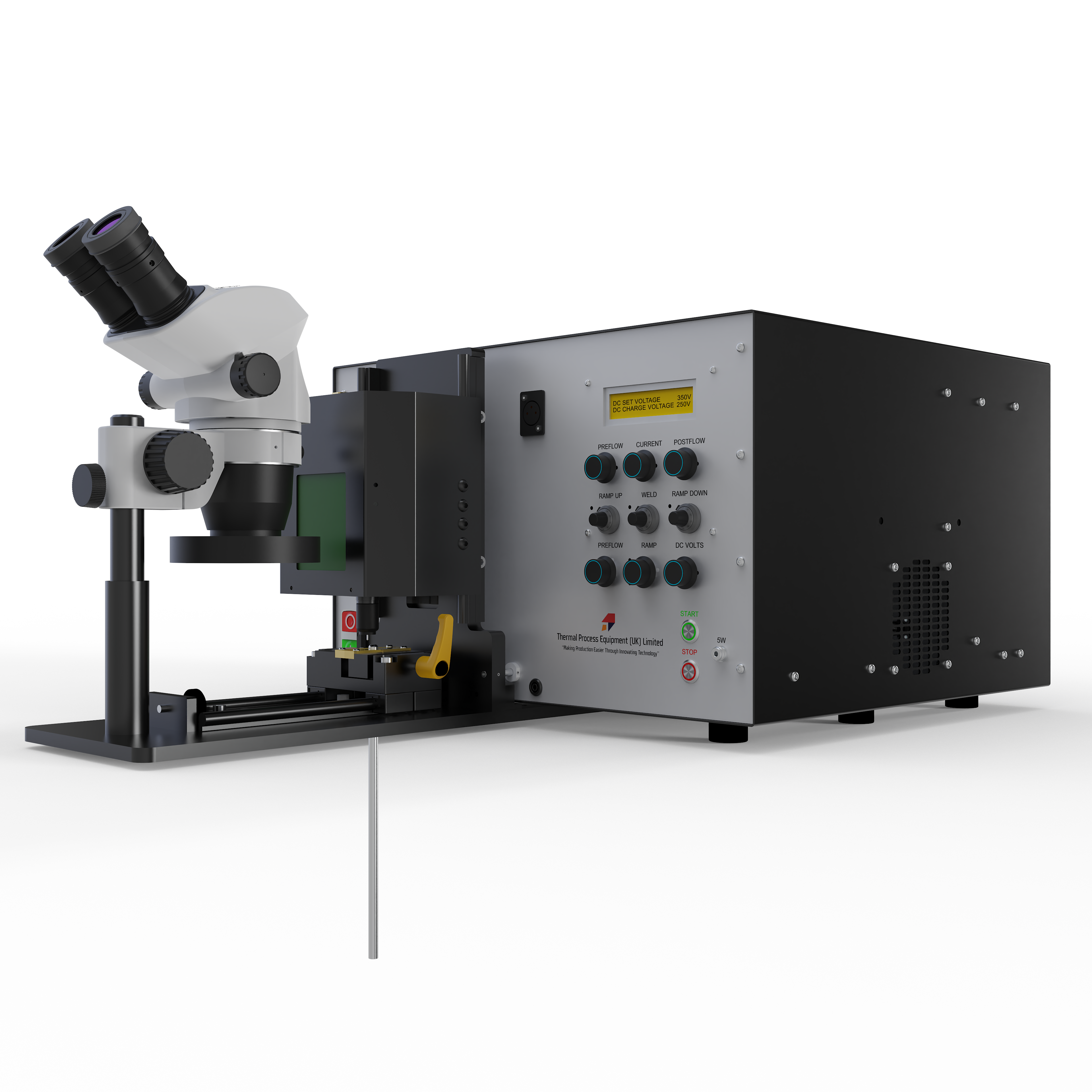 A compact, production-ready welding system combining TIG sheath welding and capacitance discharge (CD) conductor welding into a single precision workstation for thermocouple manufacture. The machine delivers micrometer-accurate weld positioning and consistent weld quality across a wide range of cable diameters. Wear-resistant Elkonite jaw sets are used to withstand the thermal and electrical demands of both TIG and CD welding, ensuring long service life in production environments. A Nikon stereoscopic microscope with high-intensity LED ring illumination provides clear inspection of the weld zone, while a dedicated welding-glass viewing window allows real-time observation during operation. Designed for sustained duty, the system incorporates active forced-air cooling and electrically over-rated key components for reliability.